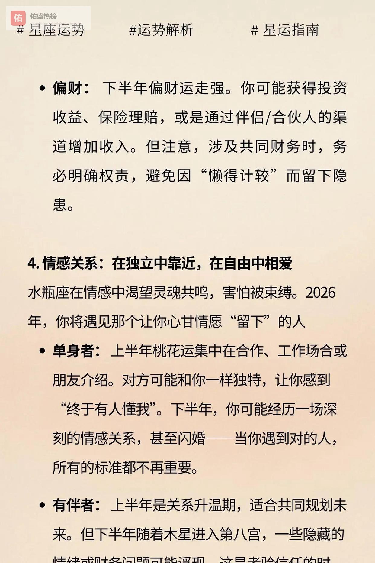 感情方面也很有戏。水瓶向来需要灵魂共振,怕被束缚。2026年你会在工作、社群、兴趣圈里遇到懂你的人。