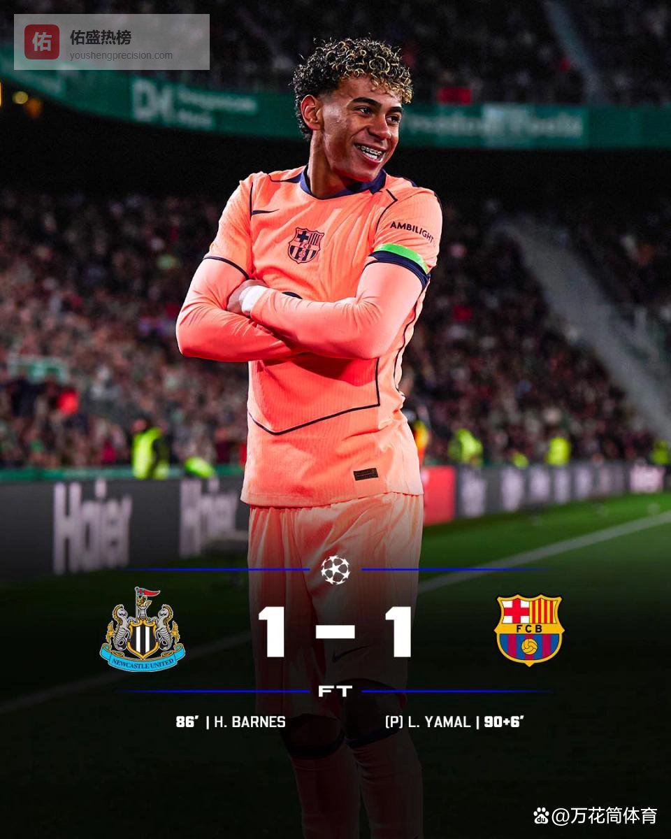 不过在补时阶段,剧情突然反转。奥尔莫在禁区内制造点球,亚马尔顶住压力主罚命中,帮助巴萨在第96分钟绝平比分。