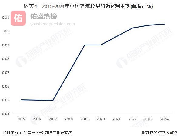 2015-2024年中国建筑垃圾资源化利用率总体上呈现增长的态势。2015年中国建筑垃圾资源化利用率仅为5%。过去十年间,我国建筑垃圾处理技术取得了较大突破,从“十二五”时期的移动式低效资源化处理,发展到“预处理 多级破碎 分级精细筛分 干/湿式切换”等较为成熟的技术路线。像破碎、筛分、再生混凝土生产等关键技术已趋于成熟,使得建筑垃圾资源化处理效率和质量均得到显著提高,为提升利用率提供了技术支撑。至2024年,增长至10.52%。