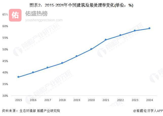 2015-2024年中国建筑垃圾处理率呈现迅速增长的趋势。2015年仅为38%,随着中国建筑垃圾处理技术提高,建筑垃圾处理率迅速增长,至2024年增长至59%。