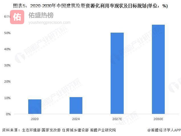 2025年6月6日,国务院办公厅转发住房城乡建设部《关于进一步加强城市建筑垃圾治理的意见》的通知,到2027年,健全城市建筑垃圾治理体系,完善建筑垃圾管理法规政策和标准规范,建筑垃圾全过程管理制度得到有效落实,偷排乱倒问题得到有效遏制,全国地级及以上城市建筑垃圾平均资源化利用率达到50%以上,城市建筑垃圾有效治理新格局基本形成。根据住房和城乡建设部、国家发展改革委印发的《城乡建设领域碳达峰实施方案》,要推进建筑垃圾集中处理、分级利用,到2030年建筑垃圾资源化利用率达到55%。