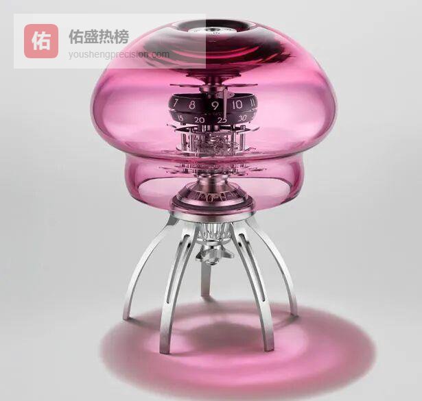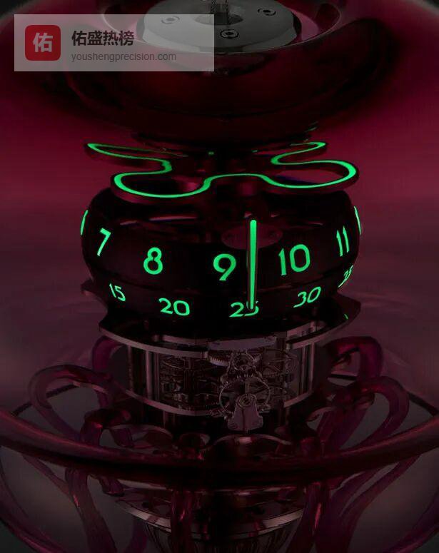 双摆环分别负责小时与分钟,手工吹制的Murano玻璃穹顶让整只钟像一盏深海探照灯。蓝、绿、粉三色各限50只,黑暗中自发光的特性,让分针的每一次跳动都像水母掠过海面。