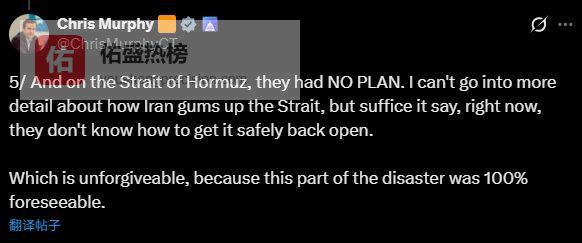 3月11日,美国康涅狄格州民主党籍联邦参议员克里斯·墨菲表示,特朗普政府“根本没有霍尔木兹海峡相关预案”。贴文截图