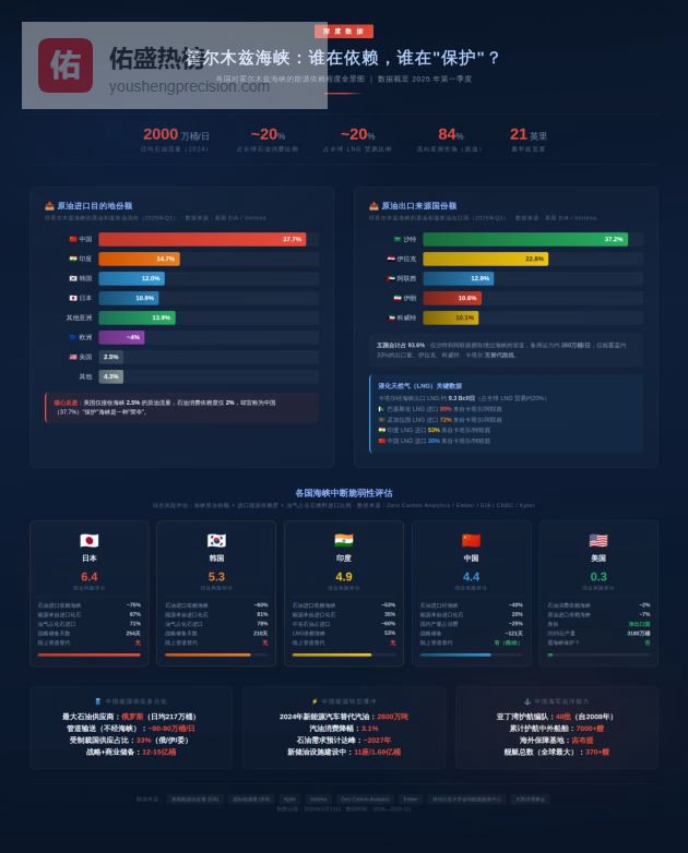 具体到国家层面,2025年第一季度的数据极为清晰地描绘了这幅依赖图景:中国以37.7%的份额独占鳌头,是接收霍尔木兹原油流量最大的单一国家;印度以14.7%位居第二;韩国占12.0%;日本占10.9%。仅中国、印度、日本、韩国四国就吸纳了海峡原油流量的约69%。国际能源署(IEA)的数据进一步指出,2025年通过霍尔木兹海峡的原油约1500万桶/日,占全球原油贸易的34%,其中中国和印度合计接收了44%的份额。