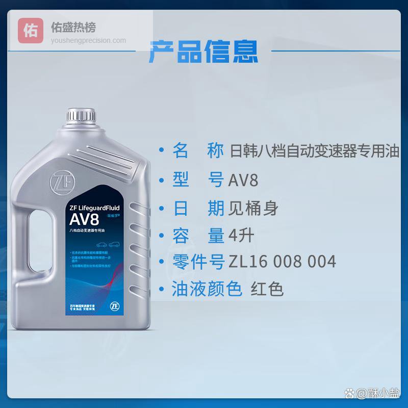 【商品推荐】5:采埃孚ZF AV8八档自动变速箱油AV8专为ZF八速纵置变速箱打造,满足大众DL382及捷豹路虎8HP系列全部技术要求。它采用超高纯度PAO+烷基萘复合基础油,显著提升氧化寿命,实测换油周期可达10万公里无明显衰减。配方中特别加强了抗铜腐蚀与抗铁锈能力,全面防护阀体精密部件,避免因金属离子污染导致控制信号漂移。