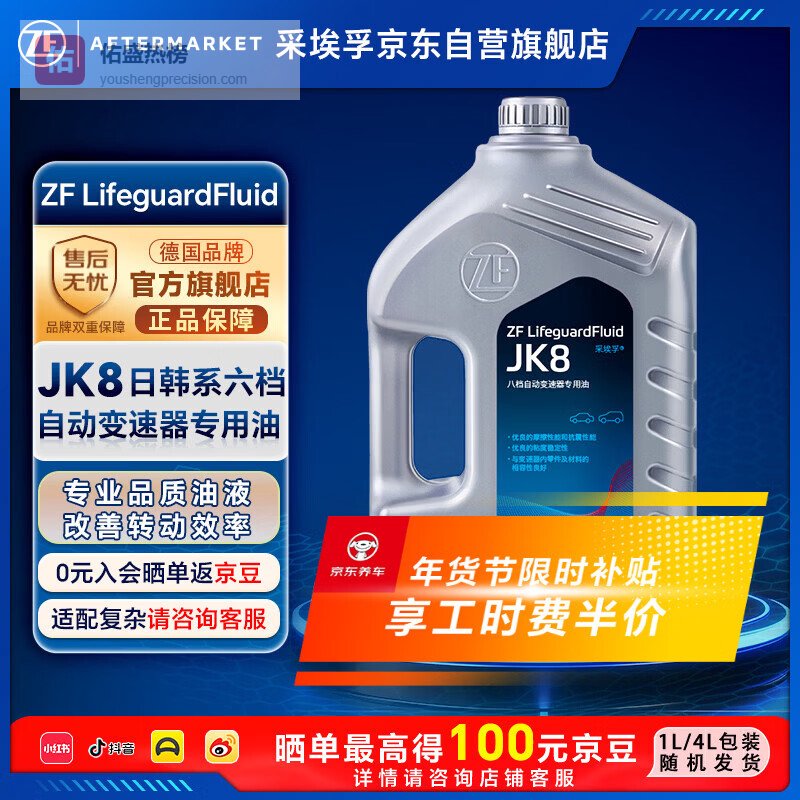 【商品推荐】4:采埃孚ZF JK8自动变速箱油JK8是ZF面向新世代8速纵置自动变速箱推出的升级版油液,全面兼容宝马GLC、X3、奥迪Q5等主流豪华SUV平台。它最大的特点是宽温域黏度曲线设计,40℃至150℃区间内黏度衰减率低于5%,确保各种工况下油膜厚度始终达标。不同于普通油依赖黏度指数改进剂,JK8从基础油分子结构就做了定向优化。