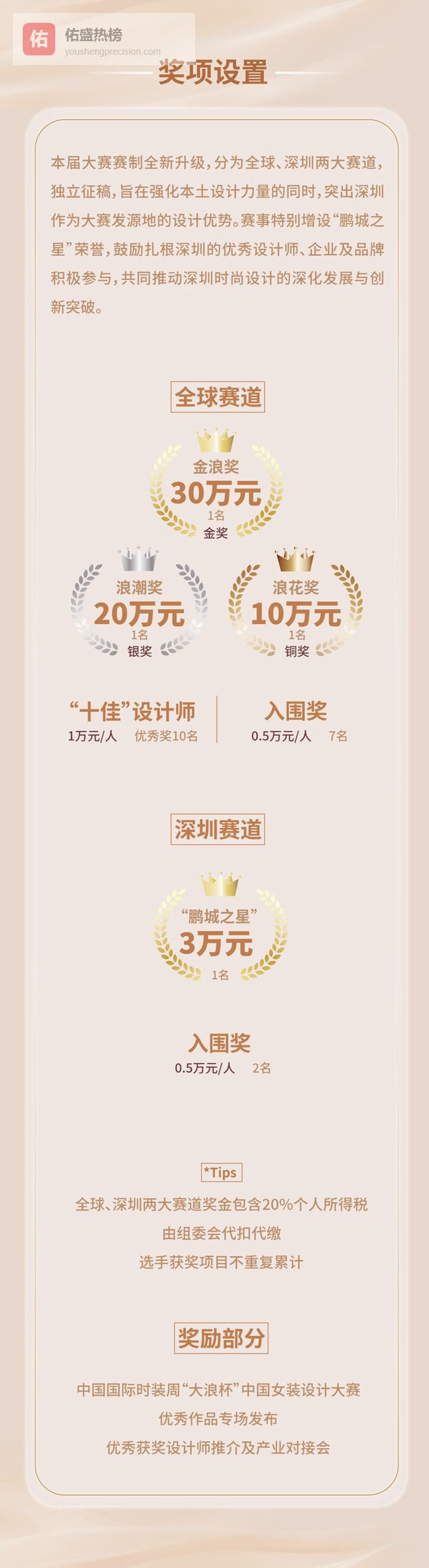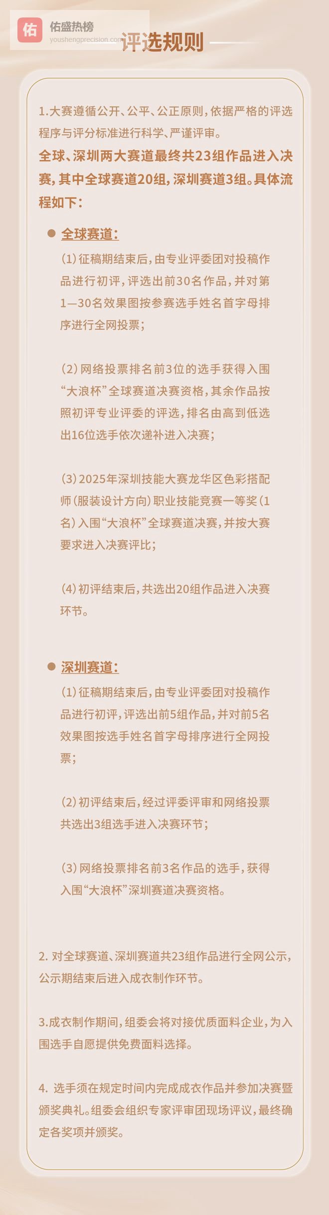 全球赛道则面向世界各国及地区的服装设计爱好者、成熟设计师、院校师生等, 最高奖项“ 金浪奖 ”高达 30万元 。 深圳赛道 则 专门面向深圳当地时尚企业,以及在深圳工作、生活、学习的服装设计人才,参赛选手需提供相关属地证明即可参与。为鼓励深圳本土设计力量创新突破,赛事特别增设 “ 鹏城之星 ” 荣誉奖项,为扎根深圳的设计师、企业及品牌提供专属激励。与此同时,大赛为本土人才搭建了从创作到落地的全链条扶持体系,依托大浪时尚小镇的产业资源,助力深圳设计师实现作品成果转化与产业落地,推动深圳时尚设计产业的深化发展。