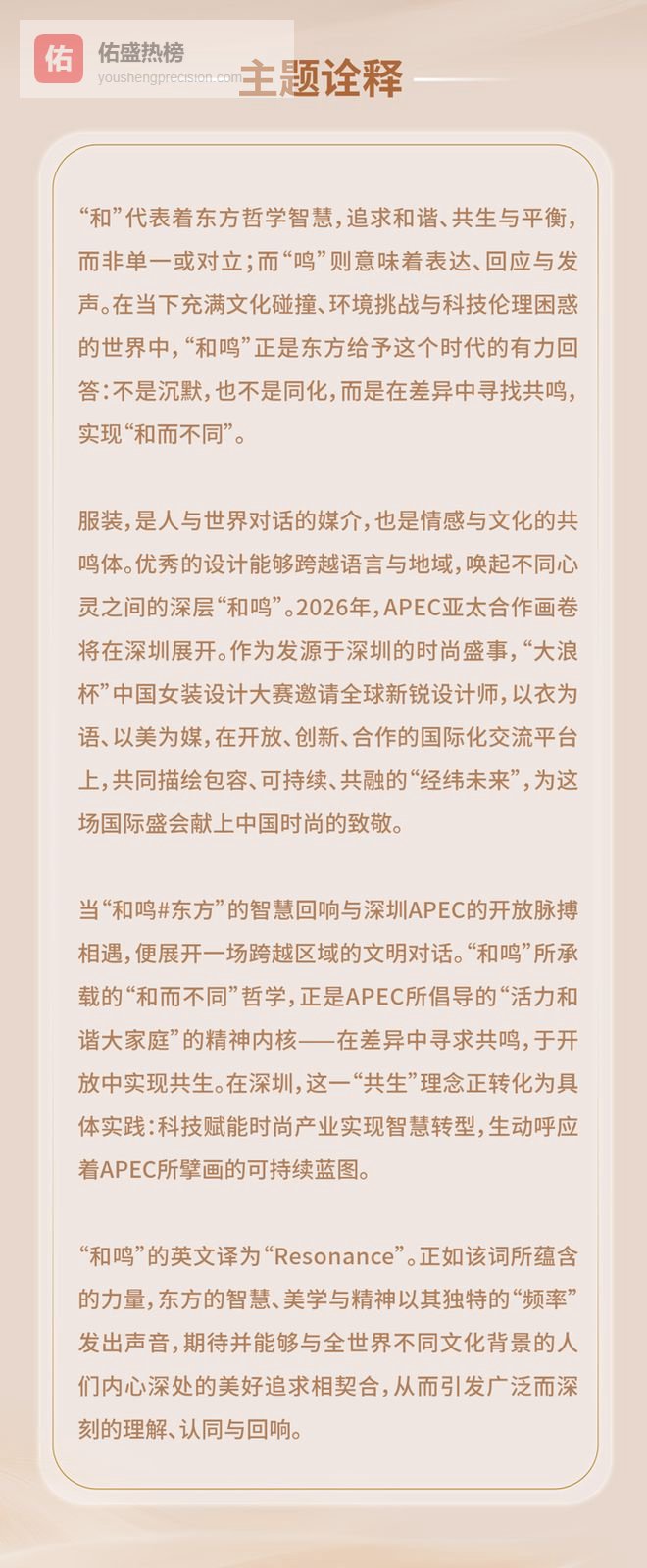 本届大赛以“和鸣# 东方”为主题,将东方“和而不同”的哲学智慧与APEC所倡导的“活 力和谐大家庭”精神内核深度融合,在文化交流与碰撞中探寻创意共鸣,展现东方美学与世界语境的融合可能。