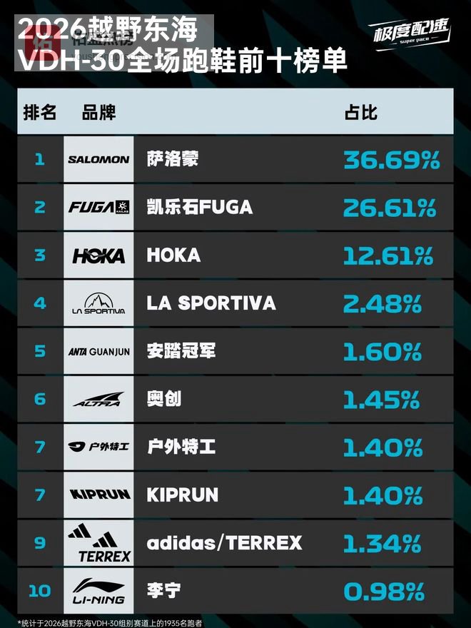 更关键的是,赛后的数据进一步印证了Salomon的市场影响力:赛后统计显示,36.69%的参赛跑者选择穿着Salomon跑鞋参赛,以明显优势位列所有品牌第一。这一数字不仅体现了Salomon在越野跑装备市场持续提升的占有率,也折射出品牌影响力的深层变化——从精英运动员的专业选择,到大众跑者的广泛认可,越来越多跑者正在用实际行动完成“用脚投票”。