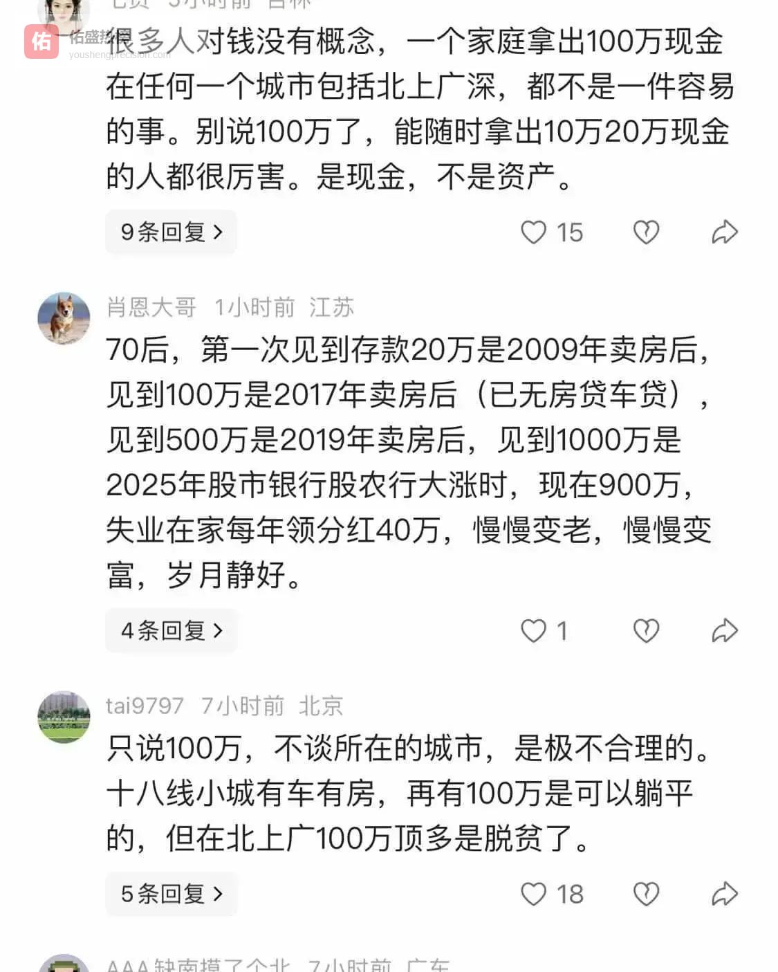 这笔钱的分量,在不同坐标下截然不同。上海的一百万,可能只够买间老破小的厕所,是三线城市购买力的三分之一。五十岁以上的人,财富往往凝固在早年分的房改房里,加上一份不多不少的养老金,构成生活的全部锚点。而三十五岁以下的年轻人,在房产和资本盛宴散场后才匆匆赶到,他们的一百万,是工资条上一笔笔硬抠下来的,带着加班后颈椎的酸胀和外卖盒的油腻味。这是最干净,也最沉重的一百万。
