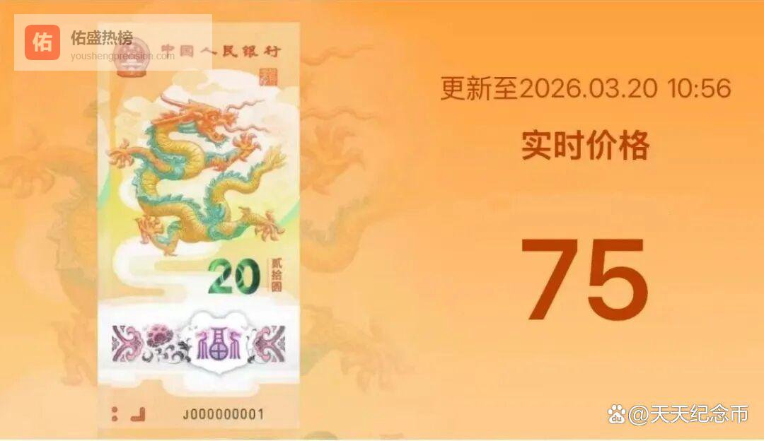 截至2026年3月22日,市场最新通货价格如下:龙年纪念钞裸钞75-78元,无4、7好号80-85元,较高点跌幅超30%。