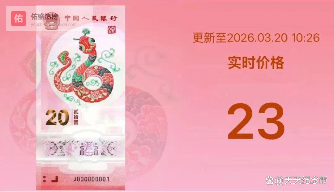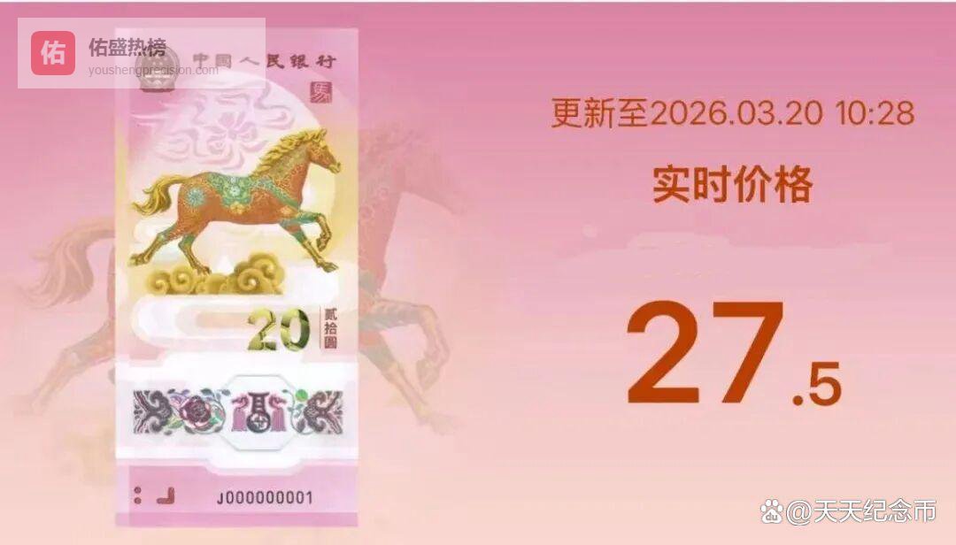 蛇年纪念钞裸钞仅22-23元,几乎贴着20元面值,较峰值跌幅超50%;2026马年纪念钞裸钞27-28元,创下发行以来新低,相比高点跌幅接近30%。