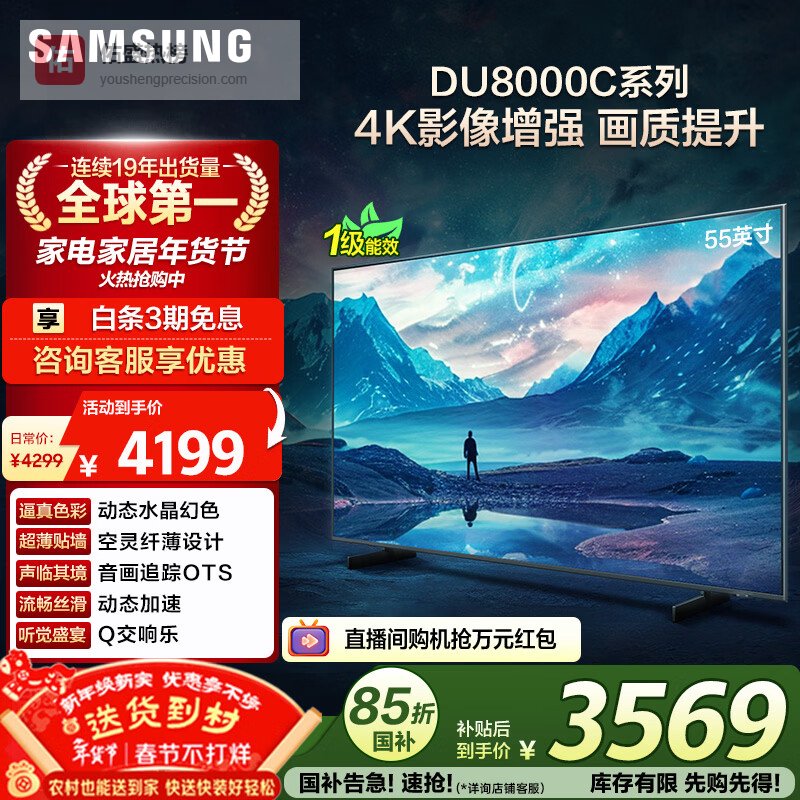 三星品质款 55DU8000C 55英寸 平板液晶AI电视 超薄4K AI智能补帧 无开机广告 UA¥