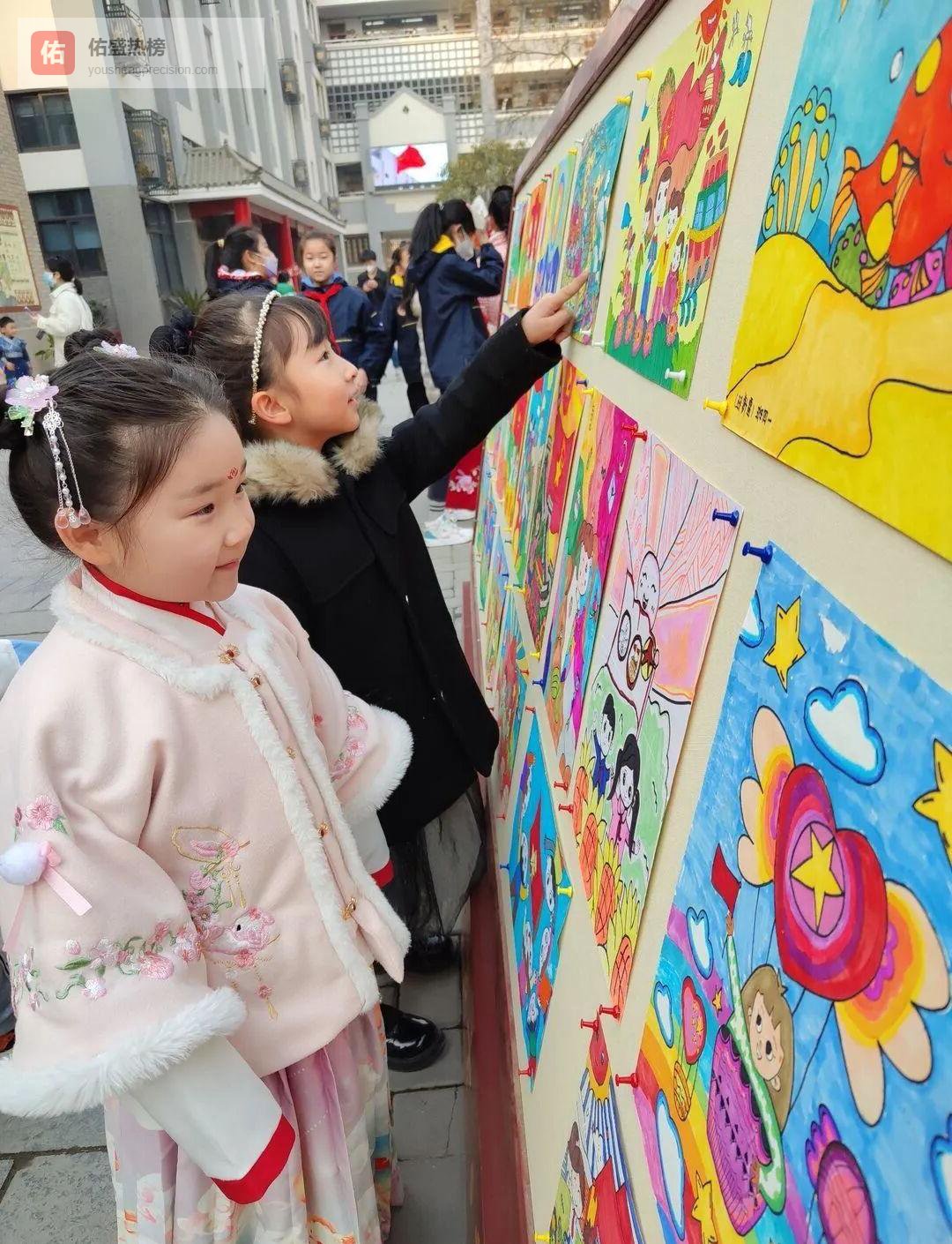 2.2 ▣ 艺术作品墙:把寒假故事写进春天 走廊另一侧,寒假作业被老师重新“拼装”:水墨长卷铺在地上,蜡染小包挂在栏杆上,每一件作品都是孩子与春天的私聊记录。路过的小朋友停下来指指点点,空气里飘着纸墨香,也飘着“我被看见”的窃喜。