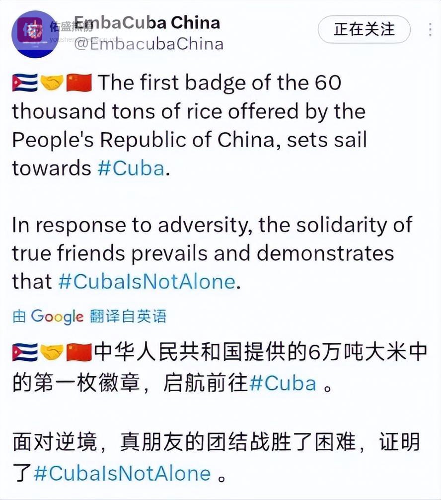 消息传回北京,古巴驻华大使白诗德在社交媒体上发了一段话,详细讲述了中方工作人员在凌晨的狂风暴雨中争分夺秒完成大米装机的情景。