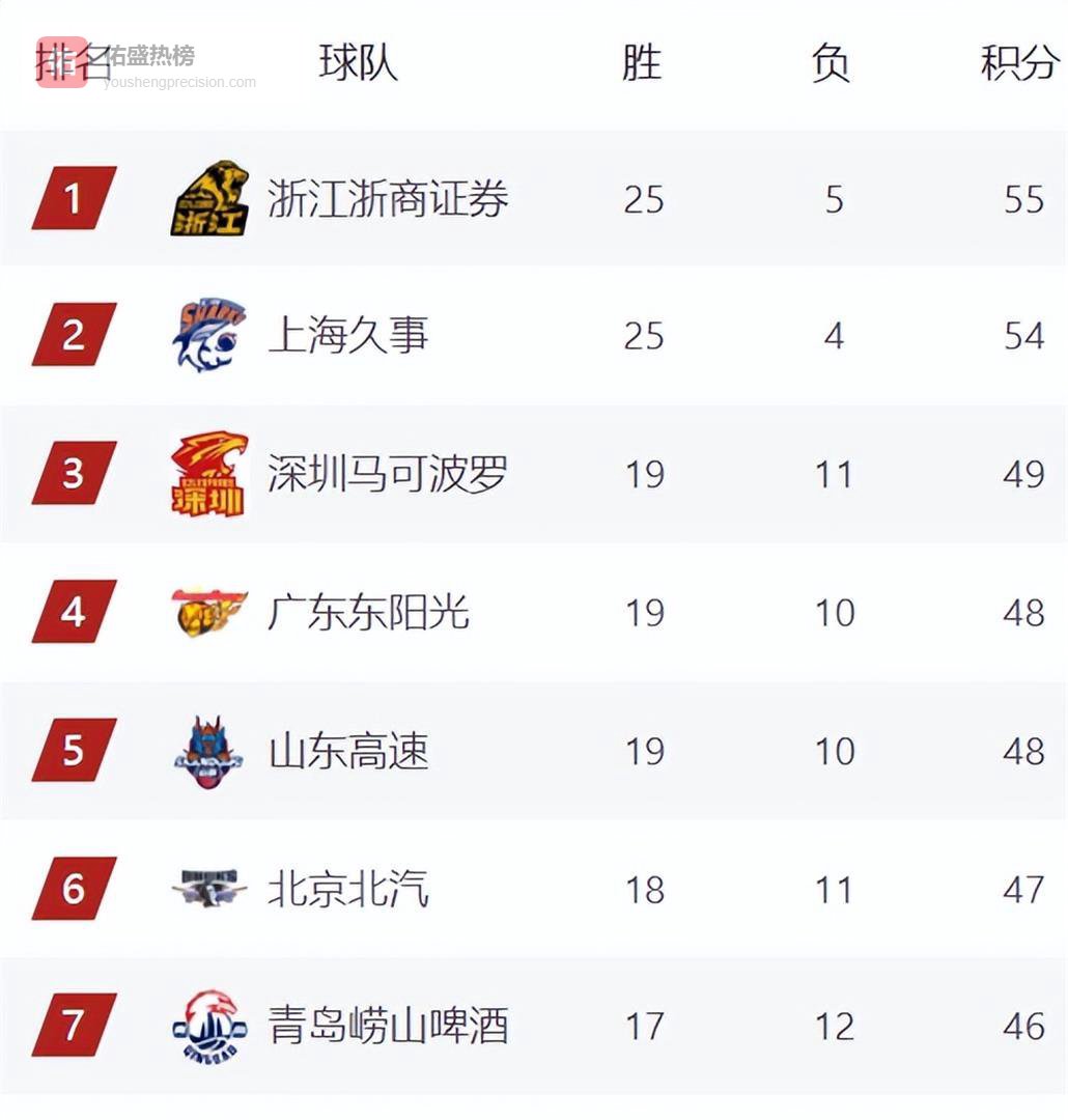 更让广东队感到压力的是,他们的战绩与排名第五的山东队完全持平,同为19胜10负。 排名第六的北京队战绩为18胜11负,也仅落后广东队1个胜场。