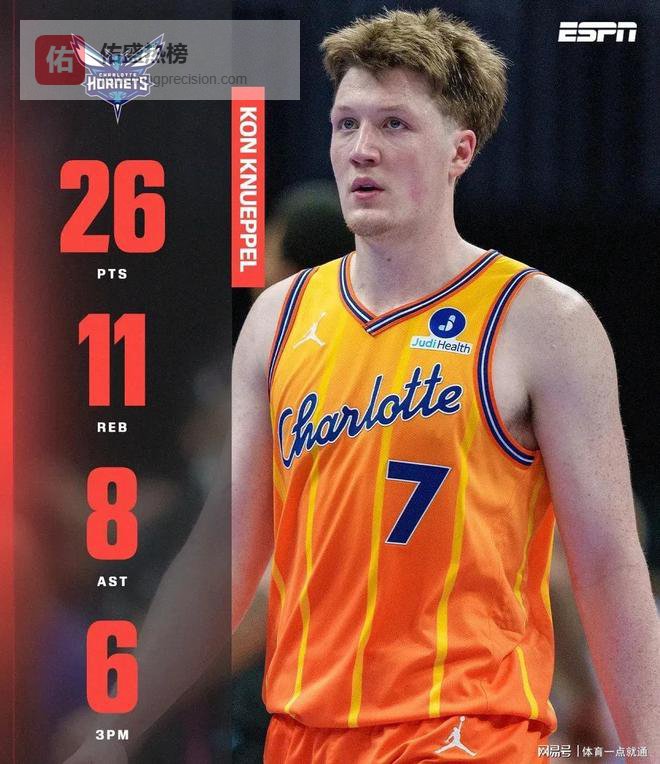 尤其是今天,黄蜂菜鸟、4号秀康·克尼佩尔表现出色,他出场36分56秒14投9中,三分10中6、罚球4中2,砍下26分11篮板8助攻。
