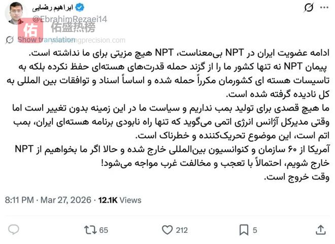 当地时间3月27日,伊朗议会国家安全与外交政策委员会发言人易卜拉欣·雷扎伊在社交媒体上发文表示,伊朗继续作为《不扩散核武器条约》成员已“毫无意义”,该条约未给伊朗带来实质性利益。
