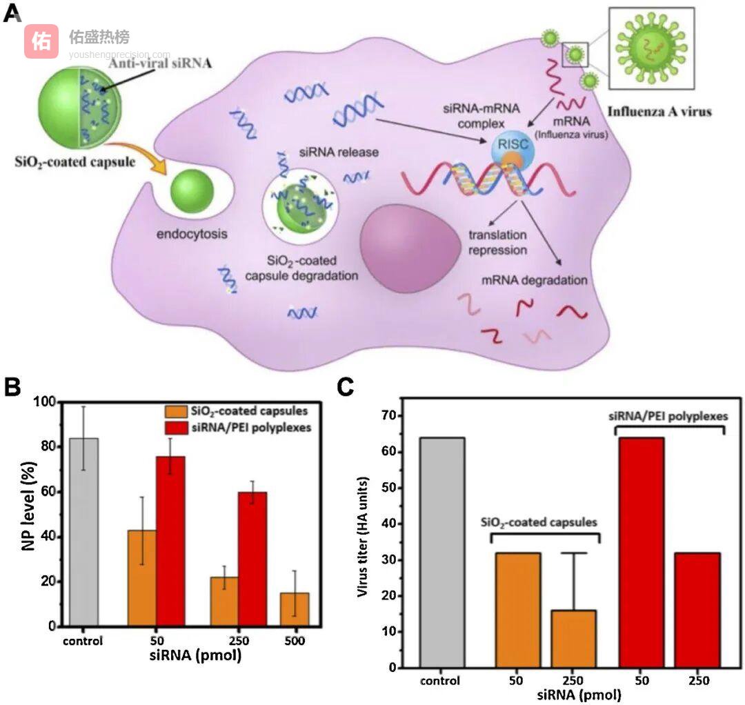 3.1 ◇ siRNA纳米胶囊:流感病毒的“基因剪刀” 以流感为例,科研团队把小干扰RNA(siRNA)封装进二氧化硅微胶囊,利用细胞内吞途径把RNA释放到胞质中,与RNA诱导沉默复合体(RISC)结合,特异性剪切病毒mRNA,从而阻断核蛋白(NP)表达。实验显示,经微胶囊处理的A549细胞上清液中H1N1病毒滴度显著下降,证明纳米载体能把基因沉默疗法安全送进呼吸道细胞。