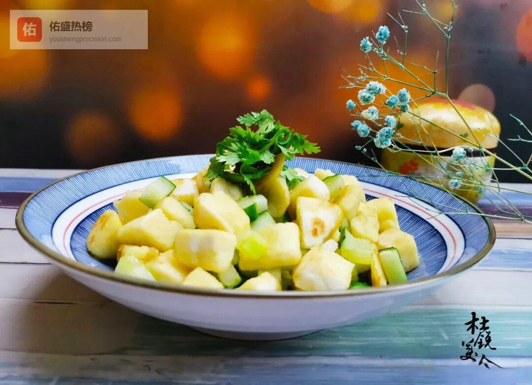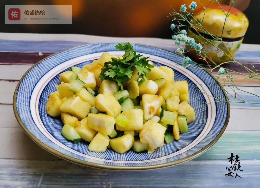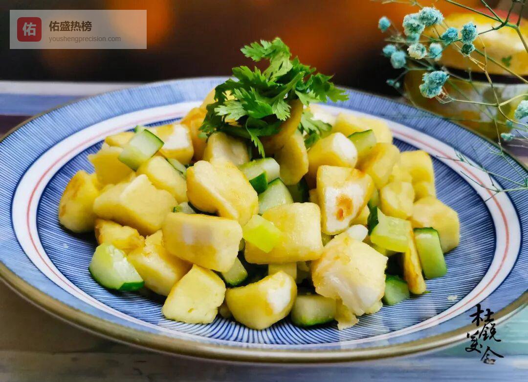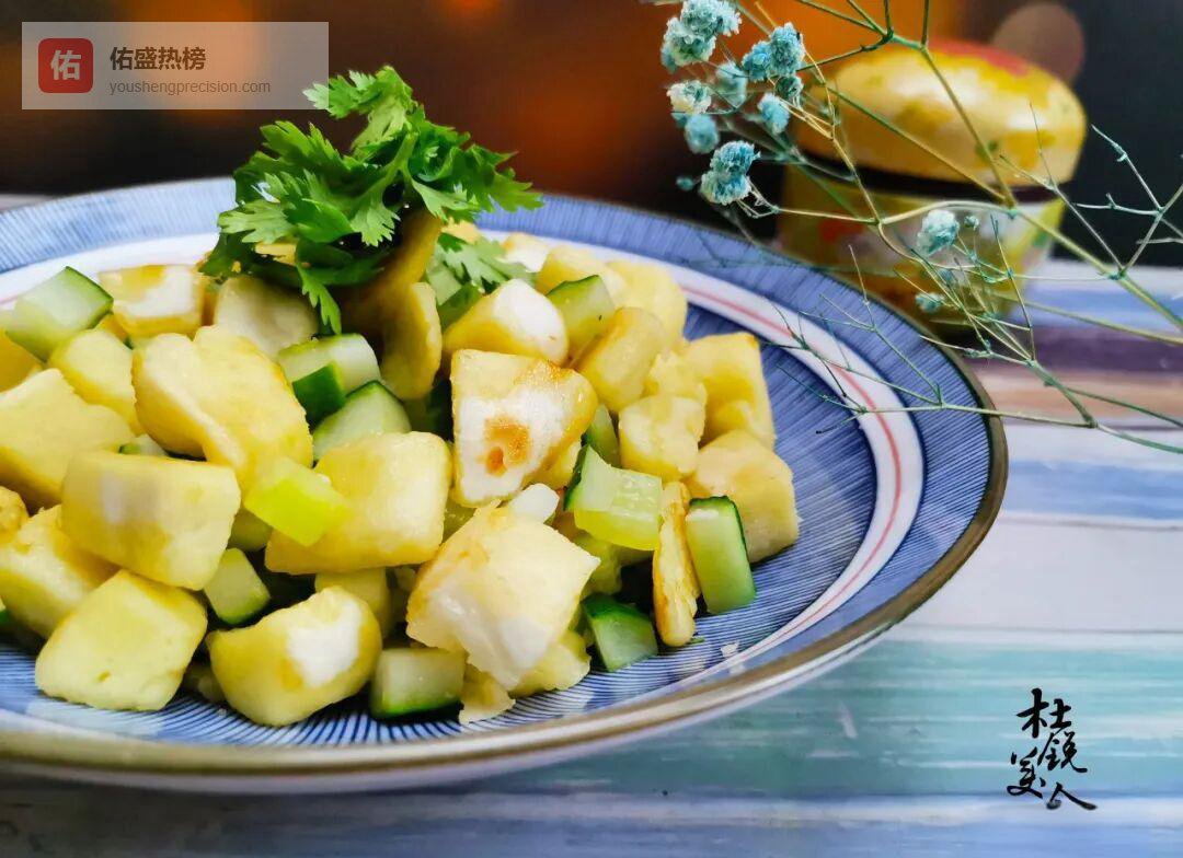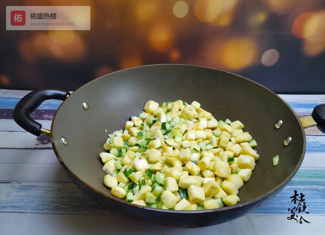 油温七成热(约200℃),倒入裹好蛋液的馒头丁,大火快炒至金黄,再撒黄瓜丁,翻十几下立刻出锅。
