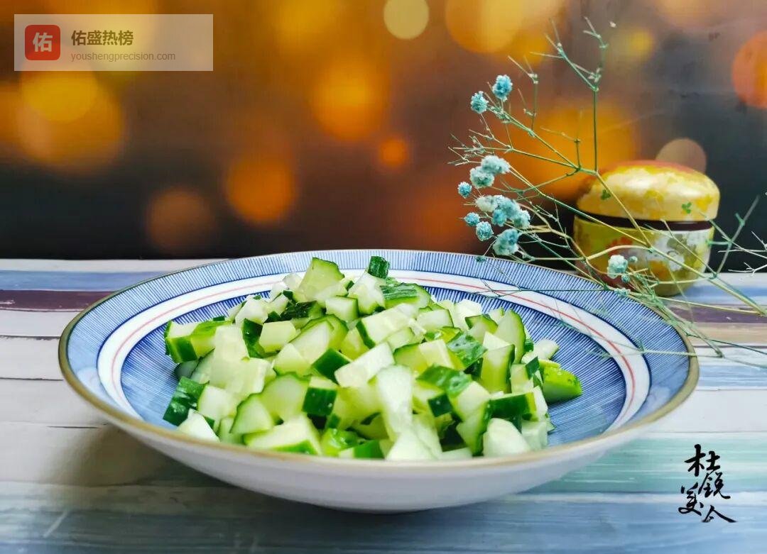 选用“锯齿刀”,把馒头切成色子块大小的骰子丁;黄瓜纵切六条,再切0.5cm小方丁,大小一致受热才均匀。