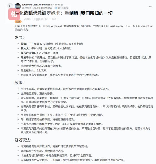 据传闻,《生化危机:代号维罗妮卡》重制版的开发由卡普空团队操刀,核心成员包括门井一宪、安保康弘以及制作人平林良章——这一组合曾成功打造《生化危机2》与《生化危机4》的重制版。项目开发进度快于预期,此前外界预计发售时间不早于2028年,但目前目标已瞄准2027年第一季度,并将同步登陆正在筹备中的Nintendo Switch 2。