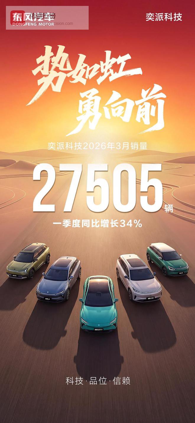 一季度同比三连涨!4月1日,东风奕派汽车科技公司(简称:奕派科技)最新销量数据,3月交付27505辆,同比增长30%;1-3月累计交付63659辆,同比增长34%,连续三个月同比增长,步入高质量发展快车道。海外市场方面,公司旗下东风奕派品牌的纳米01车型累计出口已超3万辆,稳居小型纯电出海第一梯队;东风风神品牌一季度累计出口超1.2万辆,拓展势头持续向好。