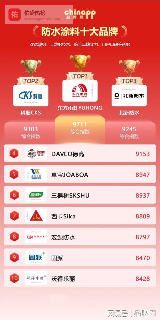 品牌网chinapp2026年防水涂料十大品牌排行榜,前十名分别是:东方雨虹YUHONG、科顺CKS、北新防水、DAVCO德高、卓宝JOABOA、三棵树SKSHU、西卡Sika、宏源防水、固派、沃得乐丽。防水涂料排行榜呈现出市面上受欢迎的防水涂料十大品牌,这些品牌的防水涂料表现出色,从防水涂料排名前十名的品牌到其他热门品牌,我们都为您推荐选择。