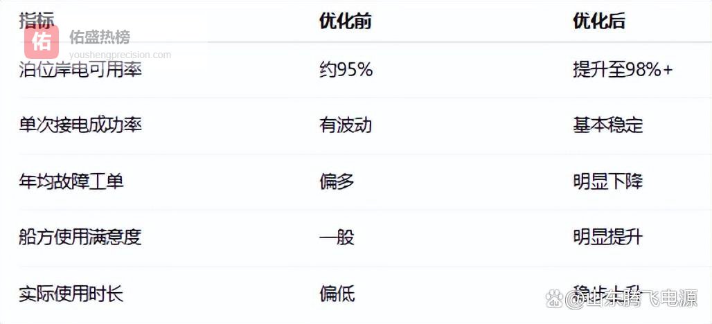 三、一个港区从“达标”走向“好用”的转变某港区在完成岸电建设后,前两年更多是“完成任务型使用”。随着环保要求和运营压力提升,开始对岸电系统进行精细化优化,重点围绕岸电电源稳定性与运维体系进行调整,运行指标出现明显变化(典型区间):