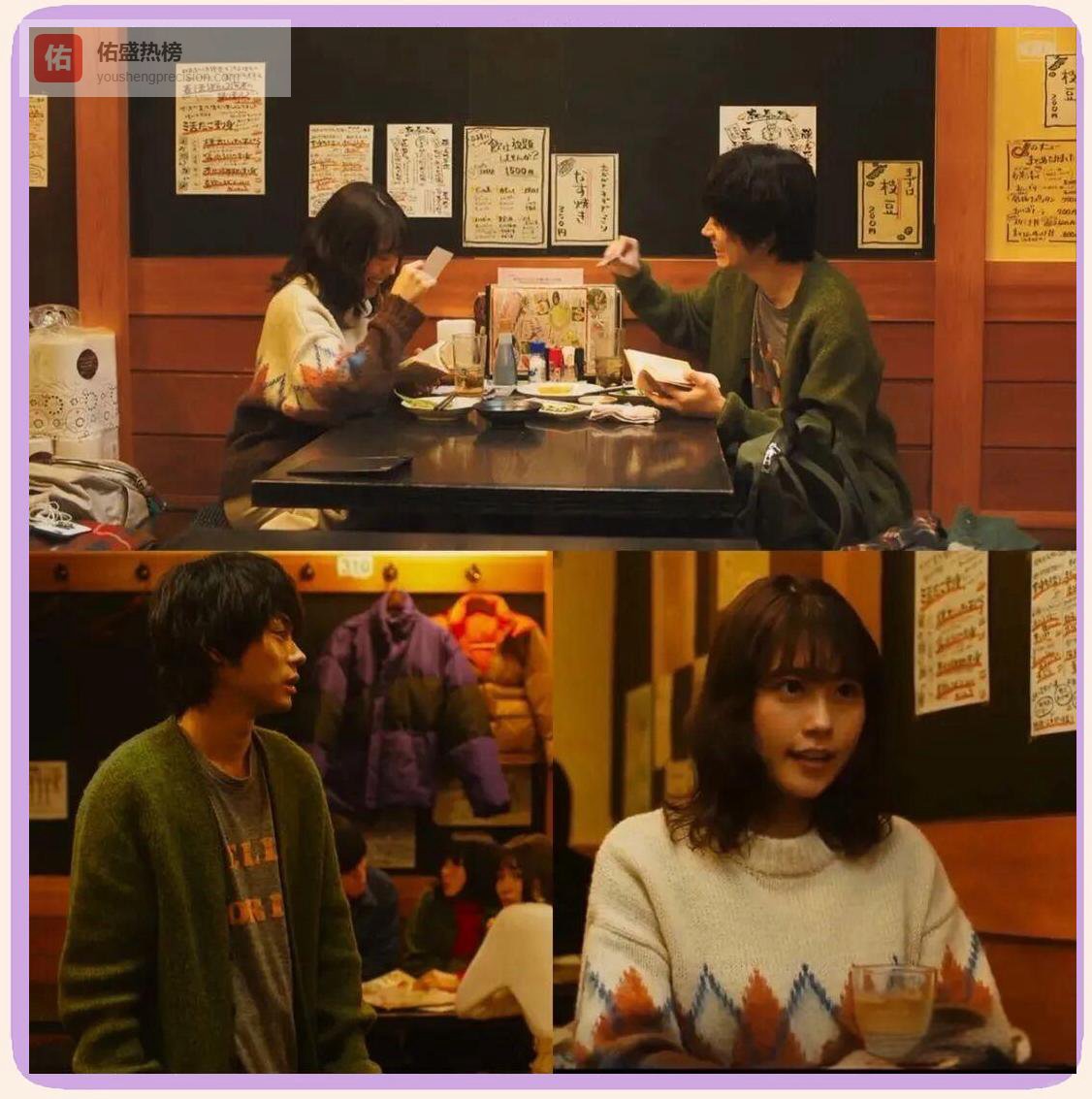 《花束般的恋爱》把“日系使用主义”穿进了每一帧。男女主角的穿搭从不刻意撞色,却像提前对过暗号:红色牛角扣大衣的热烈,对上拼色格纹外套的随性,围巾那一抹跳色,像给初遇加了字幕——“感觉有什么要开始了”。