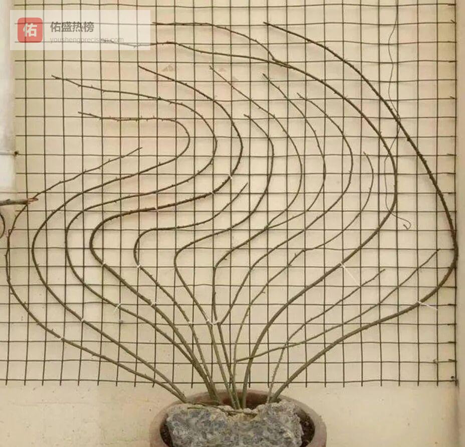 对于直立性差的藤本月季, 提前在墙面拉铁丝网,用软绳把新梢均匀固定在铁丝上。绑扎点间距20 cm左右,保证枝条呈放射状展开,后期光照更均匀,花柱不“内卷”。