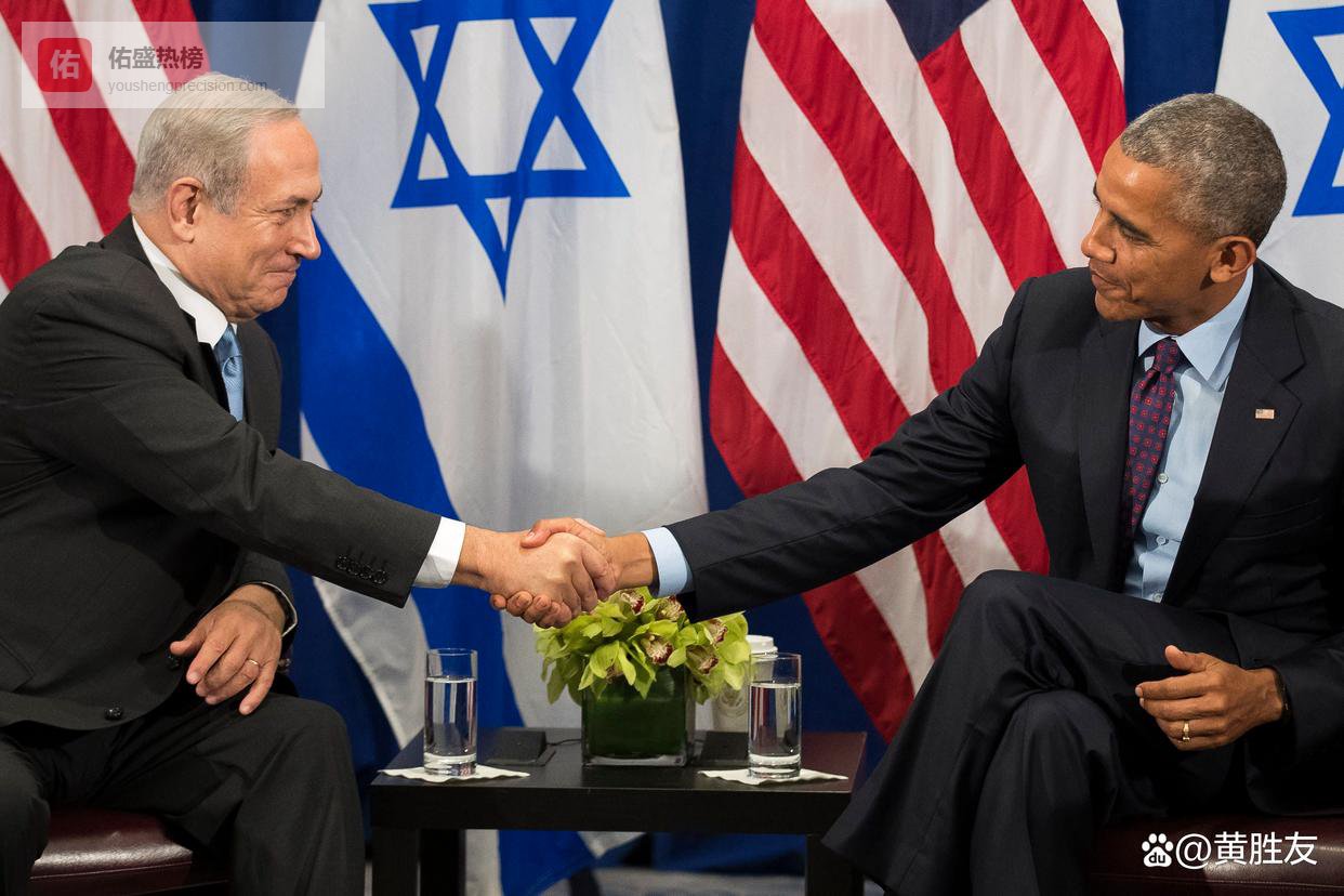 2016 年 9 月,以色列总理本雅明・内塔尼亚胡(左)与美国总统巴拉克・奥巴马在纽约会面,当月两国就以色列 10 年 380 亿美元援助方案达成一致。 美联社