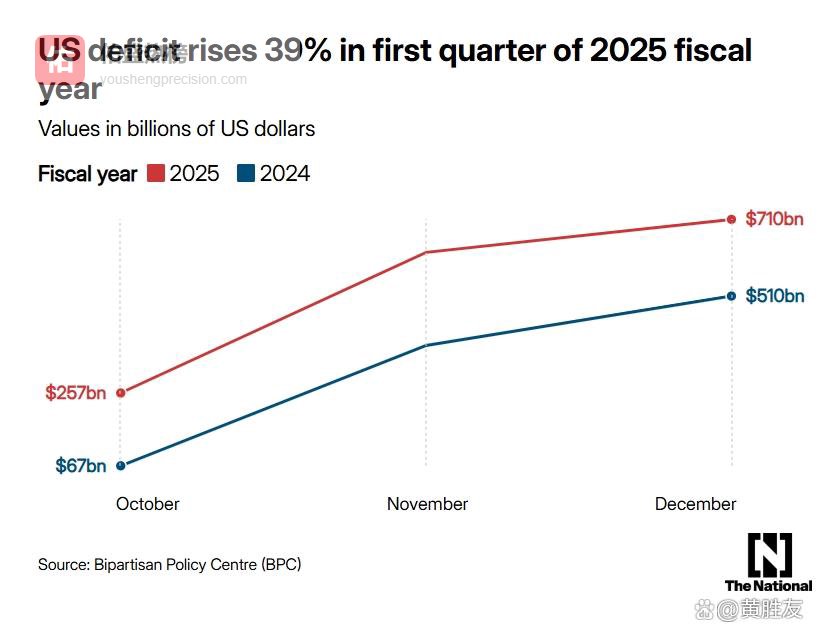 美国财政部 1 月 21 日报告显示,2025 财年前三个月,美国财政赤字扩大至 7110 亿美元,较去年同期增长 39%。