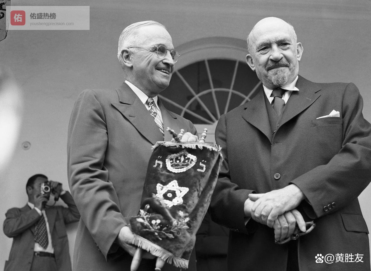 1948 年 5 月 25 日,时任美国总统哈里・S・杜鲁门(左)在访问华盛顿时接受以色列首任总统哈伊姆・魏茨曼赠送的《托拉》。盖蒂图片社
