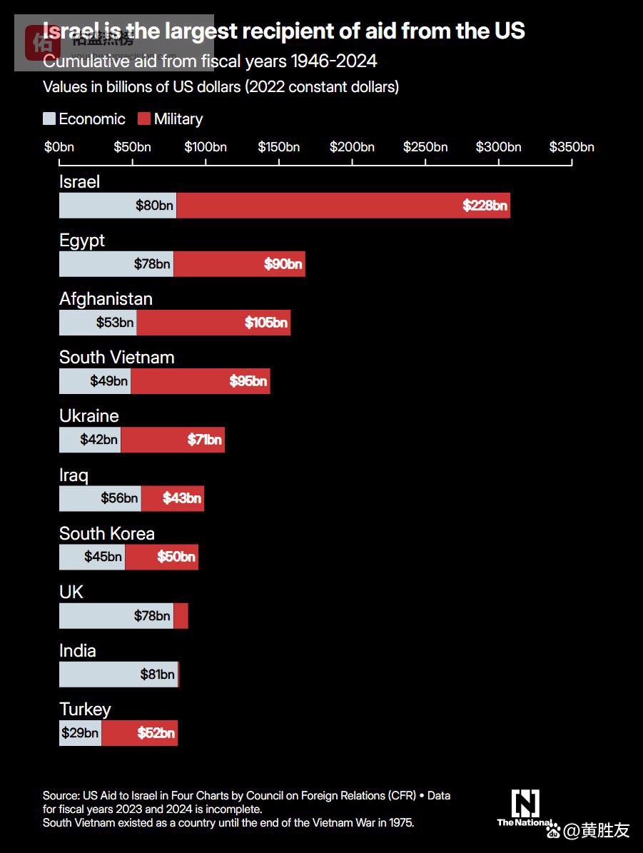 即便在政治关系紧张时期,美国对以色列持续的资金、尤其是军事援助也从未中断。华盛顿智库外交关系委员会数据显示,从 1948 年以色列建国至 2024 年,经通胀调整后,美国累计向以色列提供的援助总额超 3000 亿美元,以色列也因此成为美国对外援助累计受援最多的国家。