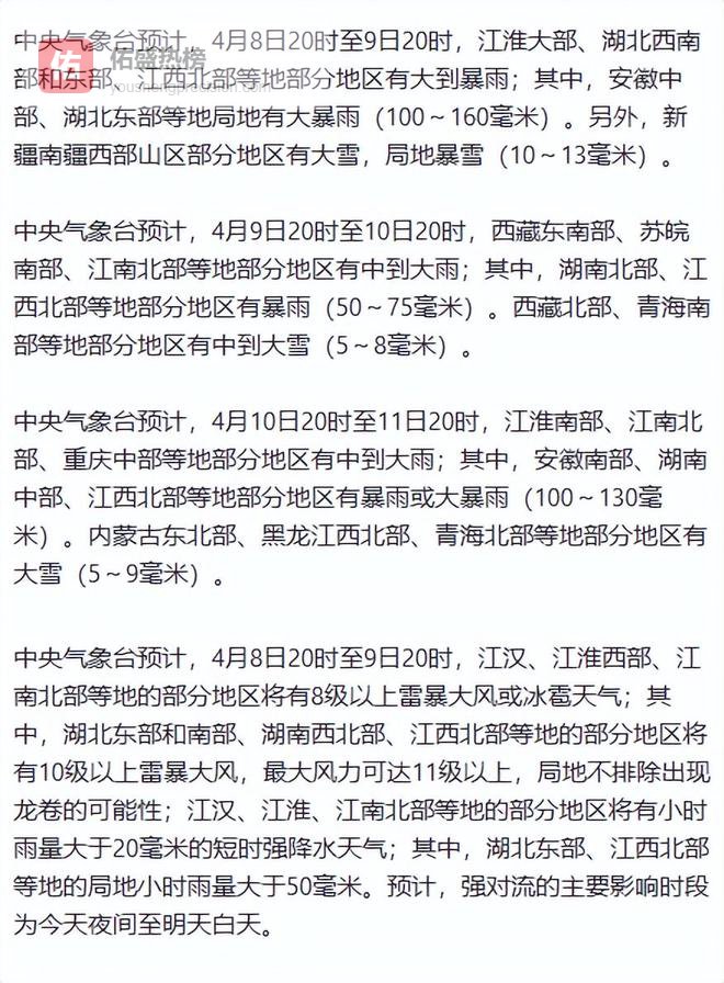 据专家介绍,如此强的急流,如同水汽的高速公路;大量水汽一路北上,在长江中下游减速聚合;因此,今晚主要为“暖区”对流降雨;明天还有冷空气逐渐参与进来,转为冷暖交汇降雨。期间,强降雨重点就在长江中下游南北两侧。到了后天(10日),冷空气继续南下,雨带转到江南。在此之后,还会在江南等地维持。另外,未来一些高纬度或高海拔地区还有降雪。为此,今晚的中央气象台,继续发布暴雨蓝色预警。