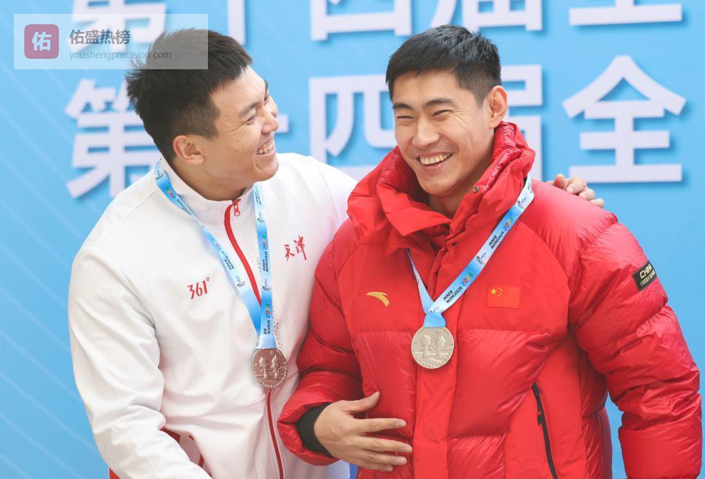 2023年11月28日,获得亚军的孙楷智/丁嵩(左)在颁奖仪式上。当日,第十四届全国冬季运动会男子双人雪车颁奖仪式在国家雪车雪橇中心举行。新华社记者 王楷焱 摄