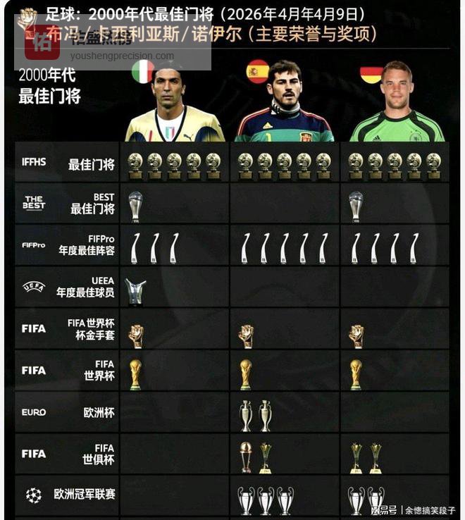 当我们把时间锚定在2000年之后,把所有顶级团队荣誉、权威个人奖项、生涯核心数据全部摊开,最终能站在这个金字塔最顶端的,只有三个名字:布冯、卡西利亚斯、诺伊尔。