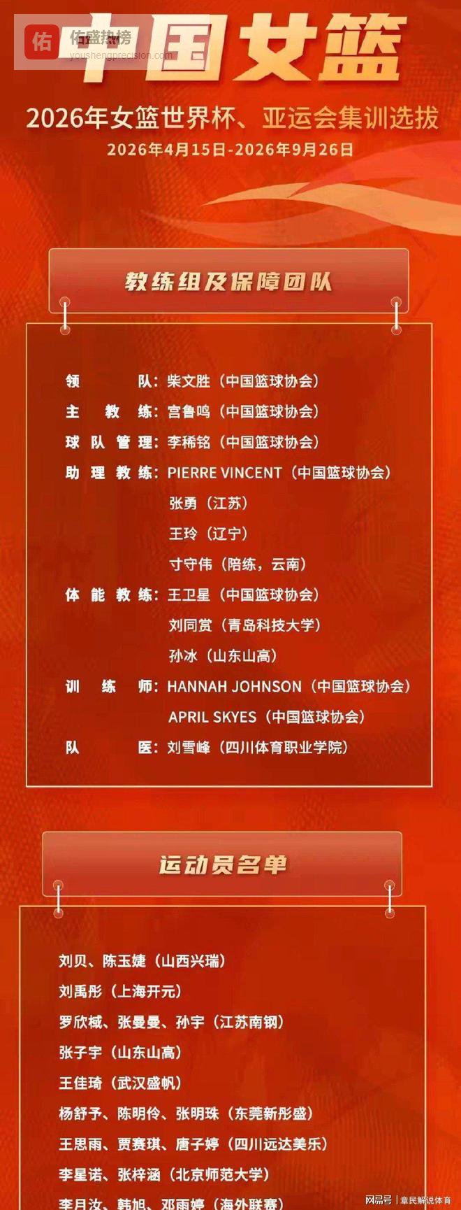 就在昨天,女篮集训名单正式公布,刘禹彤、王思雨和韩旭、李月汝领衔19名集训名单,这次集训时间从4月15日到9月26日,可以说长跨5个多月!这次长集训也创造了近年来集训时长记录。根据公布消息来看,集训目的是为世界杯和亚运会做准备。