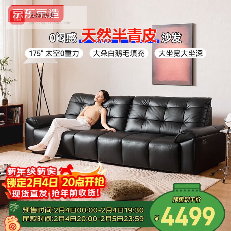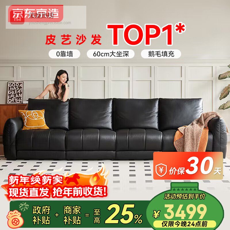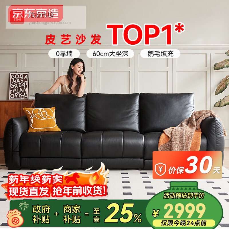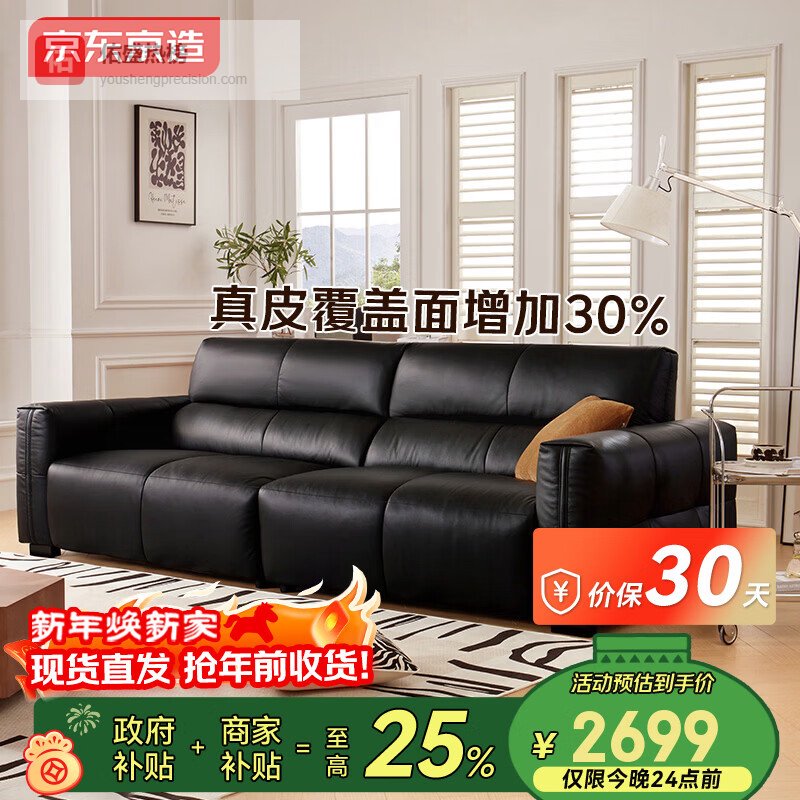 京东京造家居0靠墙大黑牛真皮沙发 头层牛皮鹅绒填充大坐深3.1米黑¥