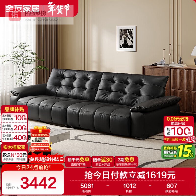 全友家居 复古轻奢风高端真皮沙发客厅家用大黑牛皮艺直排式飞鸟沙发¥