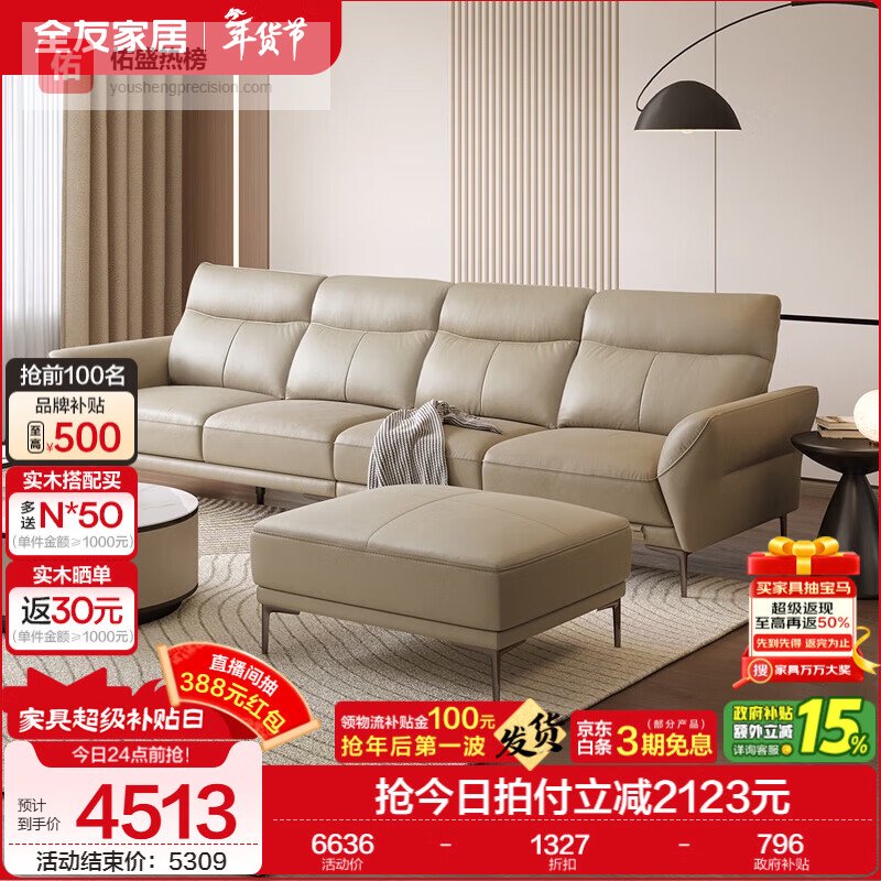 全友家居现代简约头层牛皮沙发带脚凳客厅家具直排真皮沙发茶几组合 浅卡其 | 3.0m沙发+脚凳新(102711沙发)¥