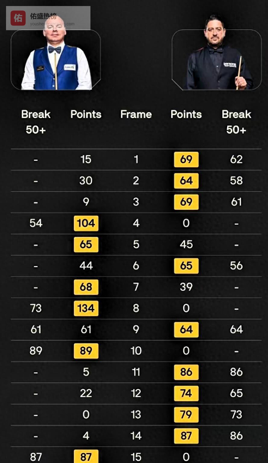 这场被外界称为“近百岁对决”的比赛,从一开始就偏离了人们的预期。 绰号“威尔士龙”的马修·史蒂文斯一上来就给了宾汉姆一个下马威,他连续三局轰出单杆67分、74分和59分,迅速取得了3比0的完美开局。 尽管宾汉姆在第四局扳回一城,但整个第一阶段比赛结束,他始终处于被动追赶的状态,以4比5的比分暂时落后。