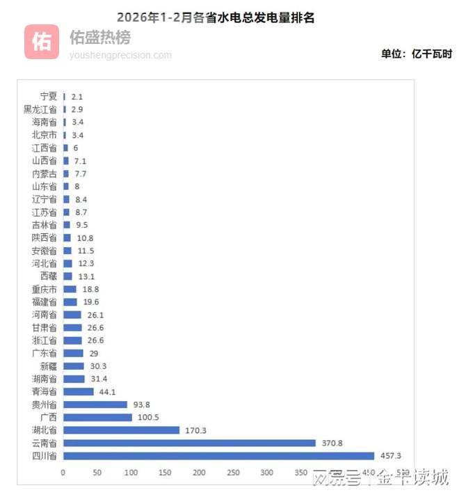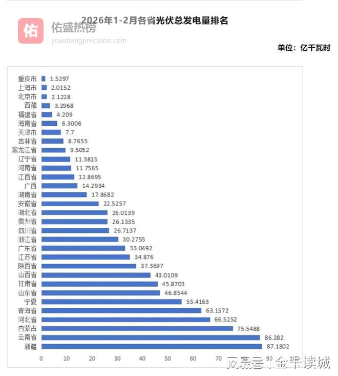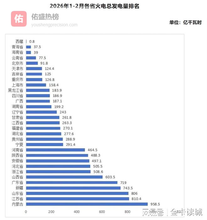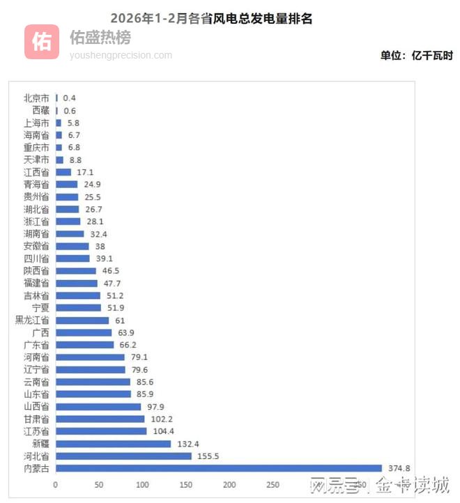 据2026年开年两个月31 省份的发电量数据,内蒙古以 1416.5 亿千瓦时稳居全国榜首,江苏、山东、广东均超过千亿千瓦时,新疆只差一线位居第五。