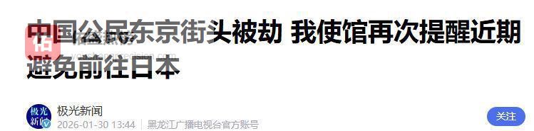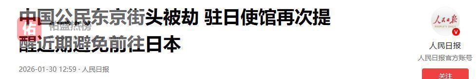 2026年1月30日,人民日报发布消息称,一位中国公民在东京街头遭遇抢劫。中国驻日本大使馆再次提醒在日中国人士,近期应避免前往日本,以保障个人安全。