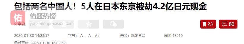 参考文章根据观察者网报道,2026年1月30日,五名嫌疑人在日本东京发动抢劫案,涉及总金额达4.2亿日元现金,其中包括两名中国人员。