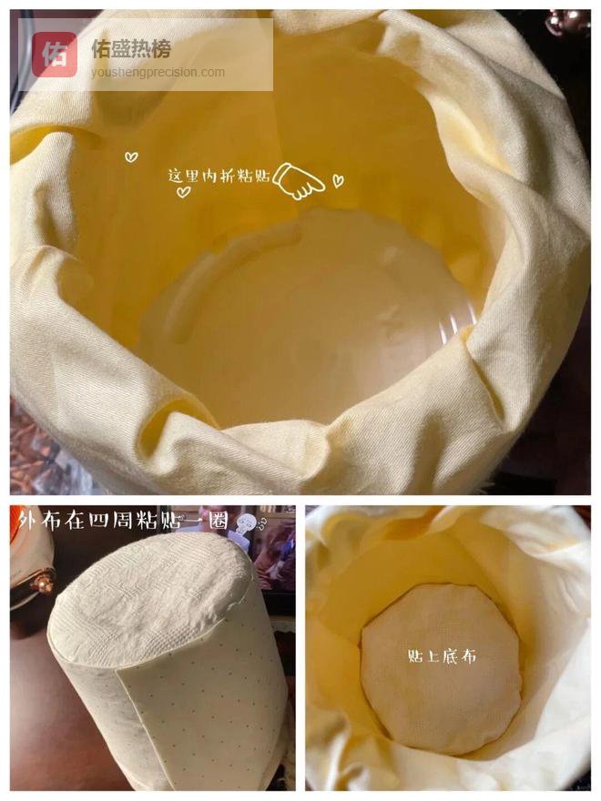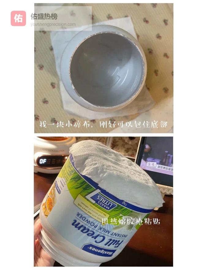 找找家里的碎布头,先将罐子的底部包裹住,用热熔胶枪粘贴。