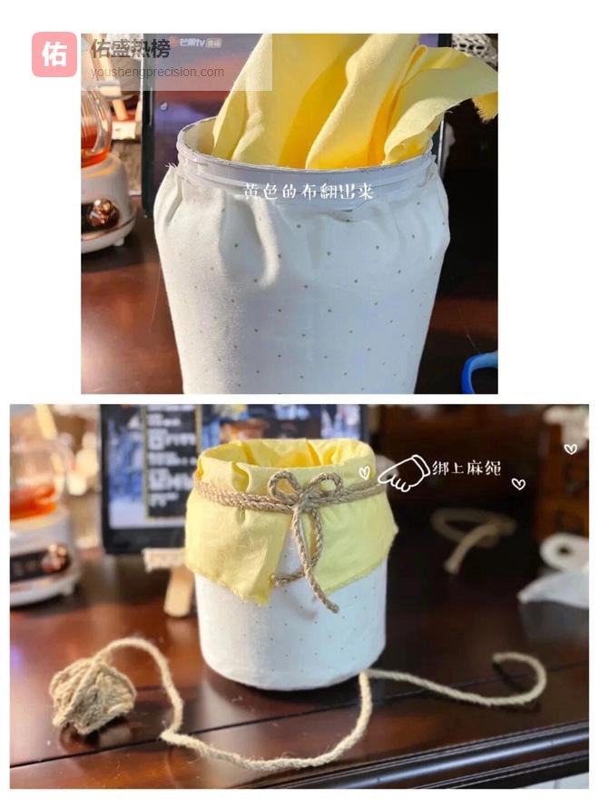 再用长条碎布包裹在空罐子全身,里面的一层大一点,外面的那一层稍微小一点。