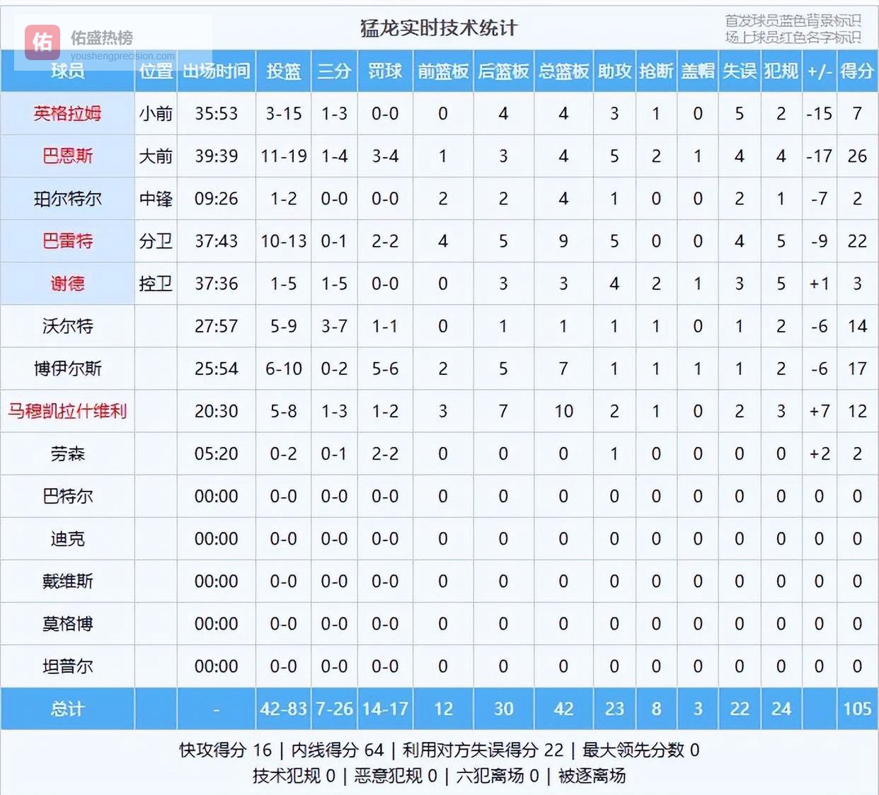 猛龙这边防守做得还可以,球员们态度也很拼,但进攻方面实在不行,失误也太多。他们的核心英格拉姆表现特别糟糕,6次出手全都没进,一分没拿,全靠替补球员勉强撑着场面。
