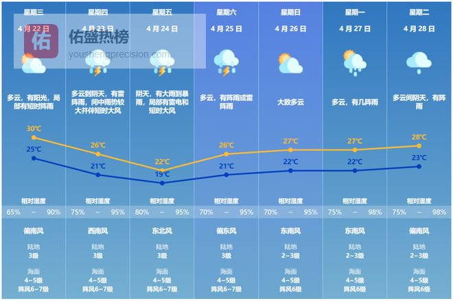 23日(周四):有雷阵雨,并伴有雷电和8-10级短时大风等强对流天气;